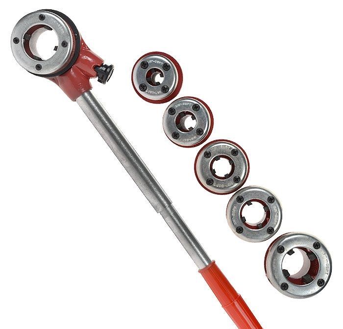 - В комплект входят 4 клуппа (1/2'', 3/4'', 1'', 1 1/4'') с правой резьбой, универсальная трещотка с ручкой, удлинитель ручки (для увеличения длины рычага).